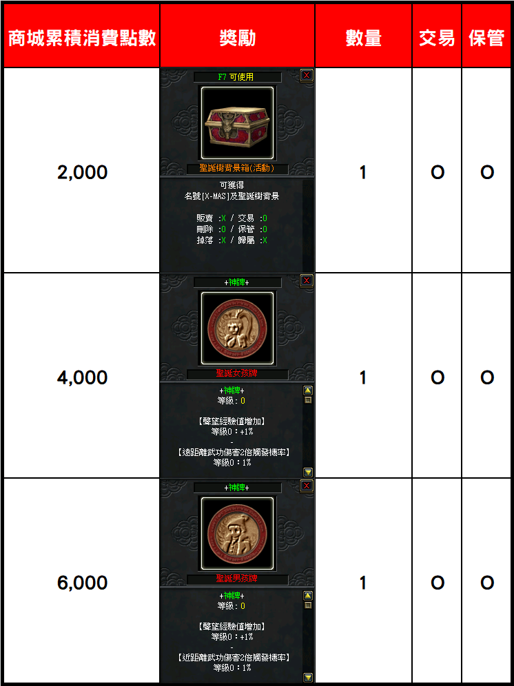 等級 聖誕男孩牌能力效果 0 1%機率近距離武功傷害2倍