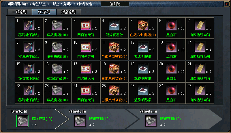 獎勵領取條件:角色聲望 ≧ 11,且必須有鑽石VIP特權狀態才可領取獎勵。