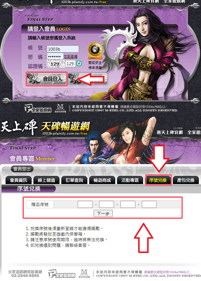 [登入會員專區]>[序號兌換]>[輸入序號]>[選擇伺服器]>[選擇角色]>[確認領獎]>[至遊戲中保管箱領取]