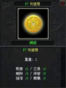 | 銅錢 | 12 | X | O | |||
