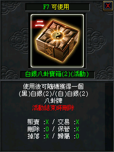 | 白銀八卦寶箱(2)(活動) | 2 | X | X | |||