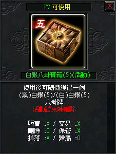 | 白銀八卦寶箱(5)(活動) | 1 | X | X | |||