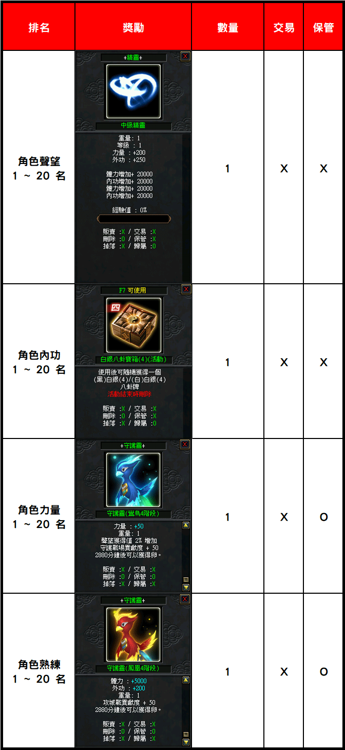 活動結束時依「角色聲望、內功、力量、熟練」排名獲得對應之獎勵。