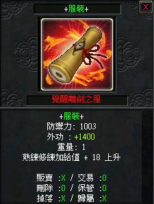 道具名稱 隨機能力1 隨機能力2 覺醒離劍之服 熟練+1100 ~ +1500 熟練修練加給值+18~+30 覺醒兌天之服 力量+1100 ~ +1500 力量修練加給值+18~+30