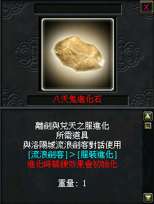 放入「離劍之服/兌天之服 + 八天鬼進化石」後有機率可將服裝進化為「覺醒離劍/兌天之服」。