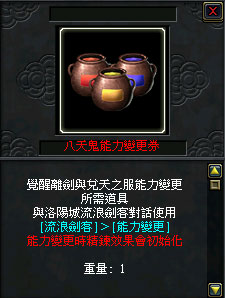 放入「覺醒離劍之服/覺醒兌天之服 + 八天鬼能力變更券」後可100%變更隨機的能力。