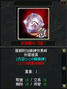 ※修練靈珠(活動)將於12/16活動結束時刪除,請於12/16維護前使用完畢。