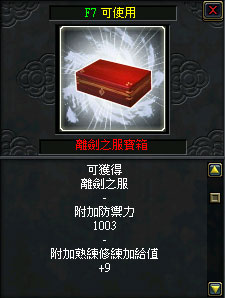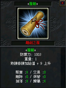 | 離劍之服 | 防禦力+1003、熟練修練加給值+9 |