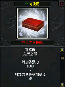 | 覺醒兌天之服 | 防禦力+1003、力量+1100~+1500、力量修練加給值+18~+30 |
