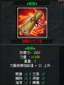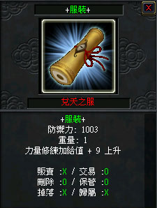 | 兌天之服 | 防禦力+1003、力量修練加給值+9 |