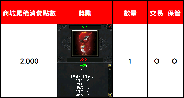 等級 成功 維持 破壞 0 > 1 O O - 1 > 2 O O O 2 > 3 O O O 3 > 4 O O O 4 > 5 O O O 5 > 6 O O O 6 > 7 O O O 7 > 8 O O O 8 > 9 O O O 9 > 10 O O O 升級需求道具 活動神牌、震月石*1、銀兩100萬