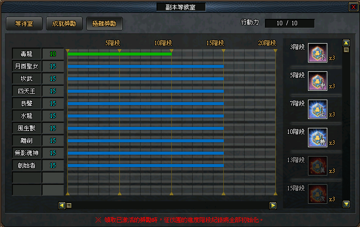 ※例如:毒龍完成極難10階段,其他征伐團副本完成極難15階段,則最高能領取10階段獎勵。