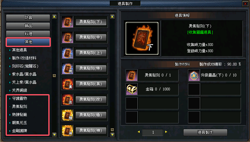 勇氣秘刻 勇氣秘刻 100% 金箱 1,000個 - - 力量 +100 力量 +100 勇氣秘刻(下) 90% 勇氣秘刻1個 升級靈晶(下) 10個 金箱 1,000個 力量 +300 力量 +300 勇氣秘刻(中) 80% 勇氣秘刻(下) 1個 升級靈晶(中) 10個 金箱 2,000個 力量 +500 力量 +500 勇氣秘刻(上) 70% 勇氣秘刻(中) 1個 升級靈晶(上) 10個 金箱 3,000個 力量 +700 力量 +700 勇氣秘刻(特) 60% 勇氣秘刻(上) 1個 升級靈晶(特) 10個 金箱 4,000個 力量 +1,000 力量 +1,000 勇氣秘刻(真) 50% 勇氣秘刻(特) 1個 升級靈晶(真) 10個 金箱 5,000個 力量 +1,300 力量 +1,300 勇氣秘刻(改) 40% 勇氣秘刻(真) 1個 升級靈晶(改) 10個 金箱 6,000個 力量 +1,800 力量 +1,800 勇氣秘刻(極) 30% 勇氣秘刻(改) 1個 升級靈晶(極) 10個 金箱 7,000個 力量 +2,500 力量 +2,500 勇氣秘刻(神) 30% 勇氣秘刻(極) 1個 升級靈晶(神) 10個 金箱 8,000個 力量 +3,500 力量 +3,500 熟練秘籤 熟練秘籤 100% 金箱 1,000個 - - 熟練 +100 熟練 +100 熟練秘籤(下) 90% 熟練秘籤1個 升級靈晶(下) 10個 金箱 1,000個 熟練 +300 熟練 +300 熟練秘籤(中) 80% 熟練秘籤(下) 1個 升級靈晶(中) 10個 金箱 2,000個 熟練 +500 熟練 +500 熟練秘籤(上) 70% 熟練秘籤(中) 1個 升級靈晶(上) 10個 金箱 3,000個 熟練 +700 熟練 +700 熟練秘籤(特) 60% 熟練秘籤(上) 1個 升級靈晶(特) 10個 金箱 4,000個 熟練 +1,000 熟練 +1,000 熟練秘籤(真) 50% 熟練秘籤(特) 1個 升級靈晶(真) 10個 金箱 5,000個 熟練 +1,300 熟練 +1,300 熟練秘籤(改) 40% 熟練秘籤(真) 1個 升級靈晶(改) 10個 金箱 6,000個 熟練 +1,800 熟練 +1,800 熟練秘籤(極) 30% 熟練秘籤(改) 1個 升級靈晶(極) 10個 金箱 7,000個 熟練 +2,500 熟練 +2,500 熟練秘籤(神) 30% 熟練秘籤(極) 1個 升級靈晶(神) 10個 金箱 8,000個 熟練 +3,500 熟練 +3,500 朝氣元玉 朝氣元玉 100% 金箱 1,000個 - - 體力 +10,000 體力 +10,000 朝氣元玉(下) 90% 朝氣元玉1個 升級靈晶(下) 10個 金箱 1,000個 體力 +30,000 體力 +30,000 朝氣元玉(中) 80% 朝氣元玉(下) 1個 升級靈晶(中) 10個 金箱 2,000個 體力 +50,000 體力 +50,000 朝氣元玉(上) 70% 朝氣元玉(中) 1個 升級靈晶(上) 10個 金箱 3,000個 體力 +100,000 體力 +100,000 朝氣元玉(特) 60% 朝氣元玉(上) 1個 升級靈晶(特) 10個 金箱 4,000個 體力 +150,000 體力 +150,000 朝氣元玉(真) 50% 朝氣元玉(特) 1個 升級靈晶(真) 10個 金箱 5,000個 體力 +200,000 體力 +200,000 朝氣元玉(改) 40% 朝氣元玉(真) 1個 升級靈晶(改) 10個 金箱 6,000個 體力 +300,000 體力 +300,000 朝氣元玉(極) 30% 朝氣元玉(改) 1個 升級靈晶(極) 10個 金箱 7,000個 體力 +450,000 體力 +450,000 朝氣元玉(神) 30% 朝氣元玉(極) 1個 升級靈晶(神) 10個 金箱 8,000個 體力 +700,000 體力 +700,000 金剛護牌 金剛護牌 100% 金箱 1,000個 - - 外功 +300 外功 +300 金剛護牌(下) 90% 金剛護牌1個 升級靈晶(下) 10個 金箱 1,000個 外功 +700 外功 +700 金剛護牌(中) 80% 金剛護牌(下) 1個 升級靈晶(中) 10個 金箱 2,000個 外功 +1,200 外功 +1,200 金剛護牌(上) 70% 金剛護牌(中) 1個 升級靈晶(上) 10個 金箱 3,000個 外功 +1,800 外功 +1,800 金剛護牌(特) 60% 金剛護牌(上) 1個 升級靈晶(特) 10個 金箱 4,000個 外功 +2,500 外功 +2,500 金剛護牌(真) 50% 金剛護牌(特) 1個 升級靈晶(真) 10個 金箱 5,000個 外功 +3,300 外功 +3,300 金剛護牌(改) 40% 金剛護牌(真) 1個 升級靈晶(改) 10個 金箱 6,000個 外功 +4,200 外功 +4,200 金剛護牌(極) 30% 金剛護牌(改) 1個 升級靈晶(極) 10個 金箱 7,000個 外功 +5,100 外功 +5,100 金剛護牌(神) 30% 金剛護牌(極) 1個 升級靈晶(神) 10個 金箱 8,000個 外功 +6,100 外功 +6,100