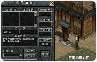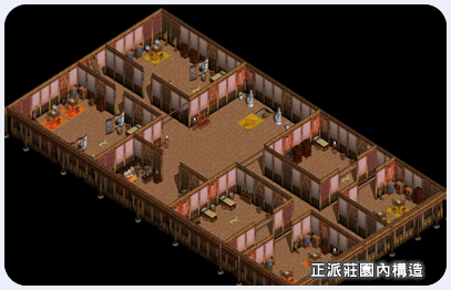除了擁有三城的幫眾之外,為了讓更多朋友都能有個〞家〞,故自 3.3 版起,在每個伺服器開放了 4 個莊院,讓您也可以擁有屬於自己的地方,以及享有 VIP 的功能,以下為第一階段莊院介紹。