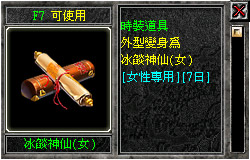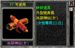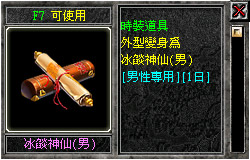 本次V6.2所新增之AVATAR系統,有別於過去以四圍為主之設定。本次的「冰燄神仙」套裝附加能力效果以「體力」及「內功」為主,修練的效果亦擴增到雙修,不用再刻意變更AVATAR,就可同時具備力量修練加給值或是打怪時追加聲望經驗值等等。